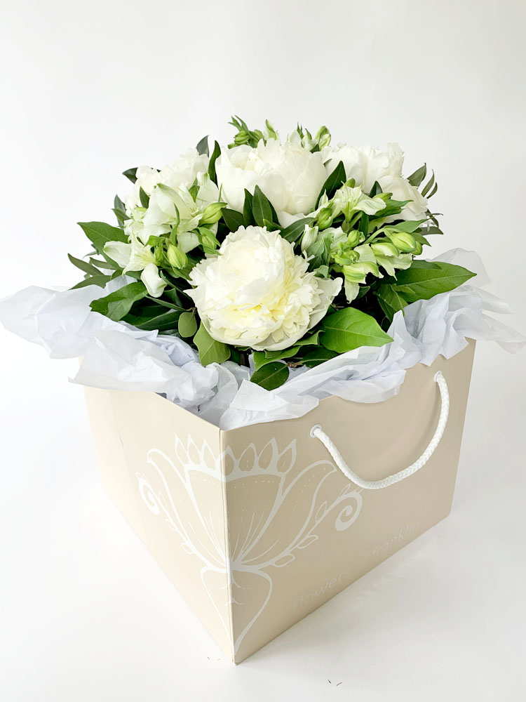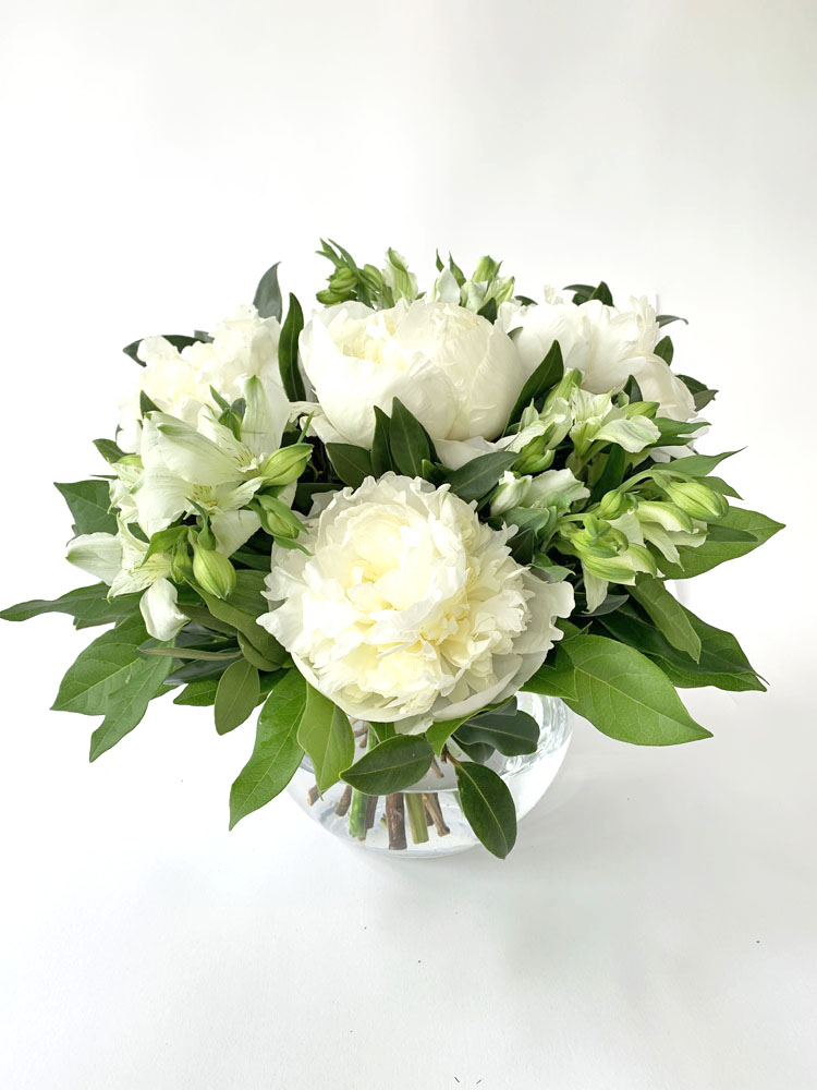 A collection of white peony mixed with other seasonal white flowers (no roses included).