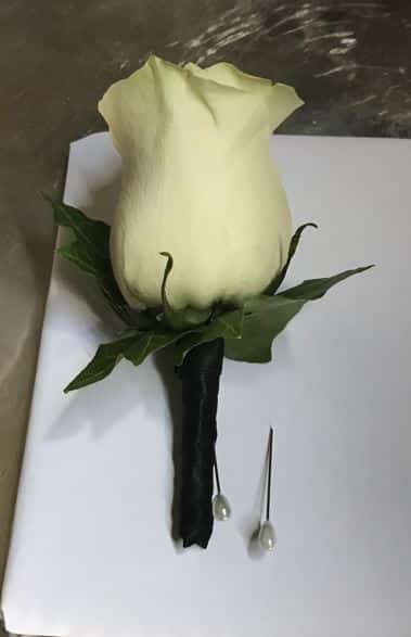 A Single White Rose Buttonhole with a detail of foliage, stem bound in black or white satin ribbon.