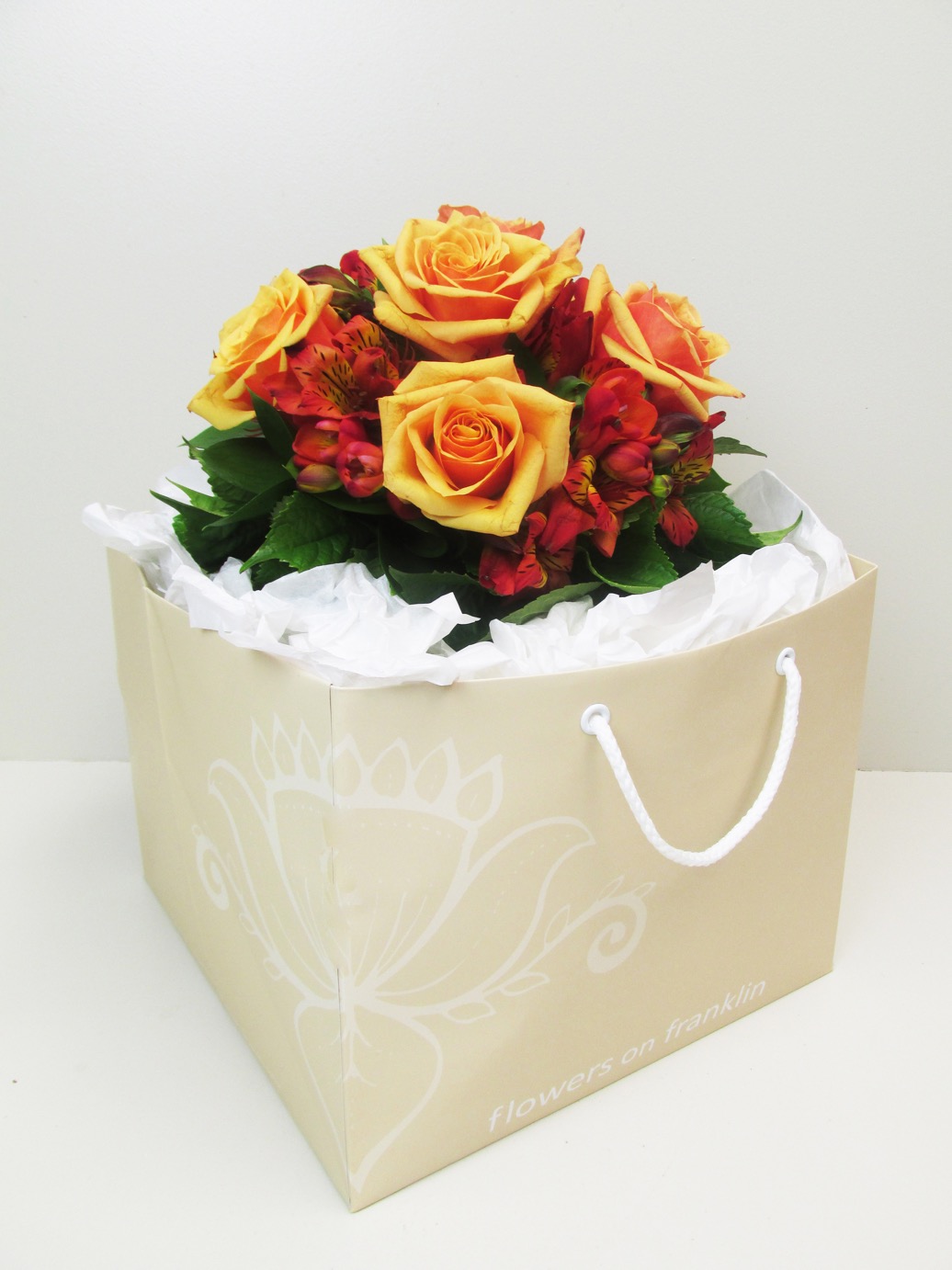A collection of flame coloured roses and seasonal flowers in vibrant rich colours.
