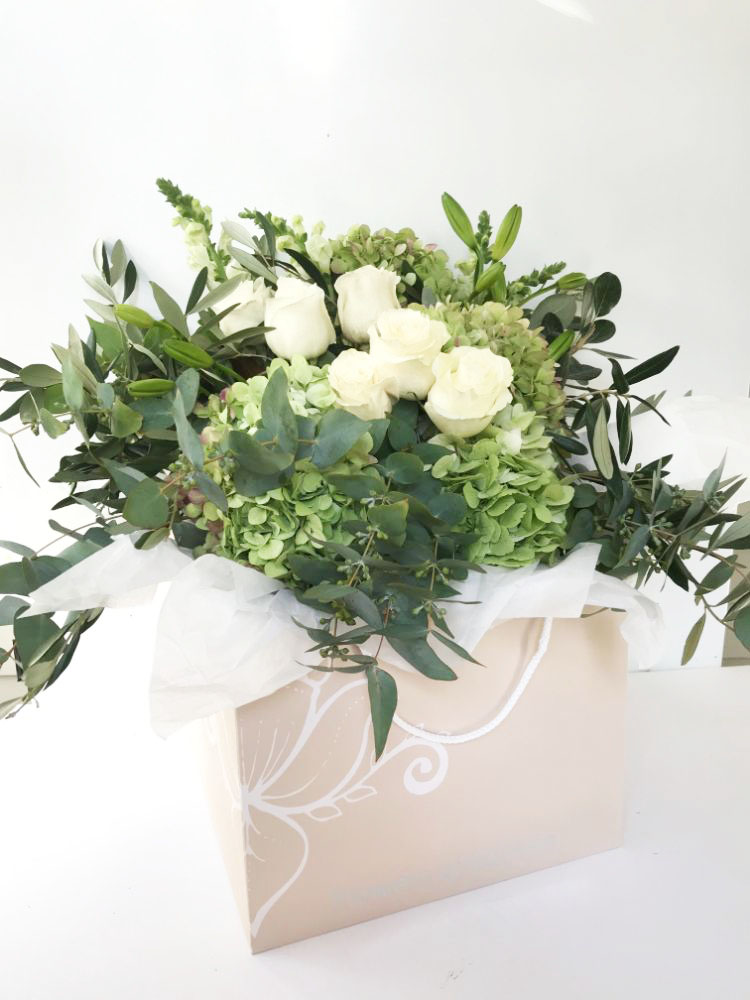A collection of seasonal flowers in dreamy white and ivory tones with green hydrangeas.